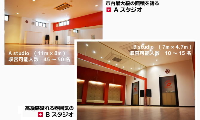 道内最大級の面積を誇るAスタジオ、おしゃれなデザインのBスタジオはダンス・演劇・撮影・セミナー等様々な目的でご利用いただけます。