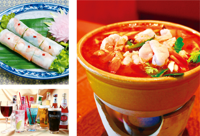 (右)TV番組で審査員全員から満点を獲得したトムヤムクン。辛さは調節可能なので、辛い物が苦手な人にもお勧め。(左上)サームロットで大人気の生春巻き! 本来はベトナム料理だがベトナムから直輸入したライスペーパーを使用。まずは生春巻きから頼むのがサームロット流。(左下)世界のビールを数種類楽しめる!世界を目指すダンサーは、サームロットで世界のビールを知っておこう! タイ本国から来日した一流シェフが腕をふるうサームロット。ソムオー新大久保店の姉妹店に持つ。本場よりおいしいかもという発言通り、ここでは本格タイ料理を堪能出来る。 自慢のトムヤムクンはTV番組の企画で審査員全員から満点を獲得したプロも認める一品。元々スープの中に海老がたくさん入っているが、さらに生の海老が上にトッピングされるので、味の染みた海老とぷりぷりの海老が味わえ、ボリューム満点。辛さも調節できるので、必ず注文したい。 多くのタイ料理をそろえているが、ランチメニューの数も豊富。サームロットランチを始め。20種類のランチがあり、何度も通って全て制覇したいところだ。 お酒の種類も豊富で、多くの世界のビールを楽しめるので、ディナーにも最適。お店の雰囲気も隠れ家的雰囲気があるので、友達を連れていくのにおススメのお店だ。