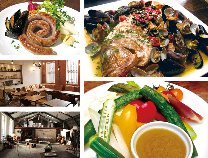 (右上:鮮魚のアクアパッツァ/右下:バーニャカウダ/左上:岩中豚の自家製ぐるぐるソーセージ ) 手作りにこだわった旬の食材を使用した美味しい季節料理。