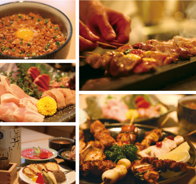(右:焼き鳥 ) 新鮮な鶏を炭火で一本一本丁寧に焼き上げた絶品。(左上:そぼろ丼)コクのある味付けでぜひ食べておきたい一品。