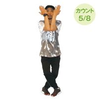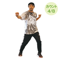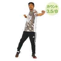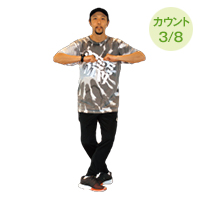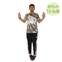 2と同様に踏み込み、広げた手を戻し肘を合わせて腕を抜きかえる(STRUT)
