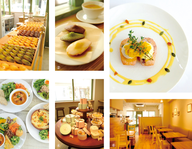 (①かぼちゃとシナモンアップルのパンプキンクリームソース:ほんのり温かいマドレーヌとアイスクリームにパンプキンモンブランが良く合う秋の新作。 ②安心な材料で毎日できたてのマドレーヌ。 ③38種類のフレーバーから常時7~9種類が店内に並ぶ。 ④プレゼントに喜ばれそうなパステルカラーがキュートなギフトボックス。 ⑤野菜をたっぷり使ったデリ、スープ、サラダと、お好きなマドレーヌが選べるランチセット。 ⑥イートインスペースでは、オリジナルスイーツ等様々なマドレーヌのアレンジメニューが楽しめる。