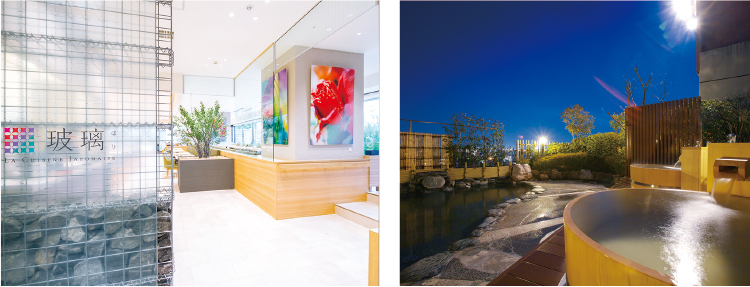 朝食のブッフェでは、じゃこ天や県内の食材を使った新鮮な料理が並びます。道後初の屋上露天風呂では、松山の情景をゆっくり楽しむ事ができます。 旅館でもホテルでもない、「茶玻瑠」という新しい寛ぎの空間がここに。 道後温泉本館のすぐそばに位置する茶玻瑠。2014年7月に誕生したレストラン「ラ・キュイジーヌ・ジャポネーズ玻璃」はオリーブの木を囲むイングリッシュガーデンから柔らかな光が差し込む開放的な空間。シェフが厳選した食材を、和のテイストと西洋の技法で仕上げた「道後キュイジーヌ」が堪能できます。道後温泉 茶玻瑠 ☎ 089-945-1321 愛媛県松山市道後湯月町4-4 部屋数/71部屋 |