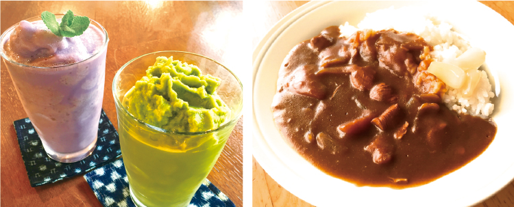 スムージーは自家栽培の川根茶とブルーベリーを使っています。コク深く、まろやかな味わいが美味しい自家製カレーライス。 美味しくて、体にやさしいメニューを大井川鉄道を眺めながら頂こう 千頭駅にほど近い体験型ミュージアム音戯の郷に併設されていて、店内からは大井川鉄道の全線が一望でき、川根の風景を楽しみながら、自家栽培の野菜や果物や地元の特産品等を豊富に使った食事や、「川根茶」を取り入れたスイーツなどが楽しめます。Café うえまる ☎ 0547-58-2021 静岡県榛原郡川根本町千頭1217-2 音戯の郷(道の駅)館内 営業時間:10:00~16:30(ラストオーダー16:00) 定休日 : 毎週火曜日、年末年始 (「音戯の郷」の定休日と同様) |