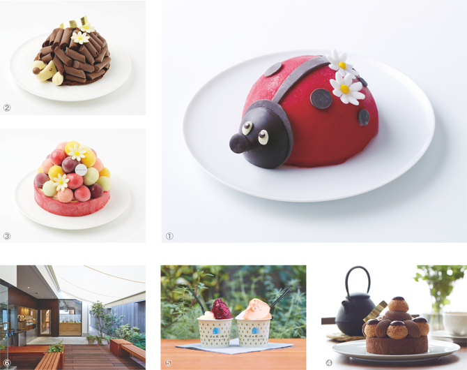 ①コクシネル:赤いベリーのゼリーでコーティングし、かわいいチョコレートの顔がつき、花で飾りつけをした幸せを呼ぶてんとう虫。