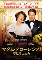 <フローレンス・フォスター・ジェンキンス> STORY 世界が憧れる音楽の殿堂 "カーネギーホール"。ここで、今なお"伝説"として語り継がれる一夜がある。1944年、フローレンス・フォスター・ジェンキンスの公演回だ。NY社交界のトップ、マダム・フローレンスの尽きない愛と財産は、夫のシンクレアと音楽に捧げられていた。ソプラノ歌手になる夢を追い続けるフローレンスだが、彼女は自分の歌唱力に致命的な欠陥があることに気づいていない。愛する妻に夢を見続けさせるため、夫のシンクレアは、マスコミを買収して信奉者だけを集めた小さなリサイタルを開催するなど忙しく献身的に立ち回っていた。しかしある日、フローレンスがカーネギーホールで歌うと言い出して―。持病を抱えながらも音楽に生きる彼女の命がけの挑戦に、シンクレアも一緒に夢をみることを決める。今、笑いと涙で包まれた奇跡の公演の幕があがる!