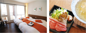 左:雄大な景観と自然の風が心地良いわたらせ温泉自慢の大露天風呂。 右:近代感覚を取り入れた落ち着いた佇まいのお部屋。 |