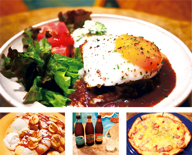 (上)1番人気メニュー「JJロコモコ」。デミグラスソースがとにかく美味。付け合せのポテトサラダが嬉しく、野菜も採れるのでバランスのとれたメニュー。(右下)ピザに使われるベーコンは自家製。その為か燻製の香りが口に広がるのでとてもリッチな気分になれる。6種類有り、サイズもSとMから選べる。リーズナブルな値段なので数種類頼むのがおススメ。(左下)ハワイではパンケーキのことを「パライ」と呼ぶ。カリカリに焼いたココナッツの食感がいいアクセントになっている。 吉祥寺で地下に眠る「HAWAII」を発見。階段を下りると、そこはもうハワイアン。南国の気分を味わえる。今まではBARとして営業を行っていたが、待望のランチもスタート。ジングルジャングル1番人気の「JJロコモコ」は食べ応え抜群。デミグラスソースは、酸味よりも肉本来の味が強く、半熟の目玉焼きを潰すと黄身と混ざって絶品ソースに生まれ変わる。そのソースとハンバーグ、ライスを一緒に食べればまさに幸せの一言。絶対に注文したいメニューだ。ハワイといえばパンケーキ!もちろんジンジャンでも美味しいパンケーキを食べることができる。バナナとバニラアイスが乗ったバナナパライは、その見た目のボリュームとは裏腹に、とても食べやすいのでペロッと完食できる。コナコーヒーと一緒に注文をすれば素敵なハワイアンタイムを過ごせるだろう。週末にはダンスイベントが行われる事もあるので、いろいろな人とエンターテイメントな時間も過ごせる。ドキドキが詰まった楽しい場所。それが「ジングルジャングル」だ。