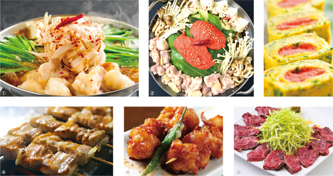 ① ② 『もつ鍋』:「博多もつ鍋 よかろう門醤油味」をはじめ、「博多みそ味」(各1480円)に加え、10周年を記念して「博多辛子明太子のもつ鍋」(1980円)も登場。ぷるんぷるんの食感と上質な和牛もつならではの脂の甘みが美味。 使用する醤油、味噌は博多のものを数種ブレンドして使用。