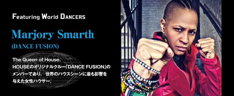 The Queen of House。 HOUSEのオリジナルクルー「DANCE FUSION」のメンバーであり、世界のハウスシーンに最も影響を与えた女性ハウサー。90年代から様々なPVやステージで活躍。OsakaDanceDelightやJapanDanceDelightでもジャッジやショーの経歴があり日本のダンスシーンにも影響を与える。 ,女性らしさを湛えたナチュラルなタッチのステップや身のこなし、アフロテイストなフィーリングは、まさにオンリーワン。 2009年より癌と戦い続け、最後まであきらめる事なく挑み、全世界のダンサーや病気と闘う人に勇気を与えてきたが、2015年2月に死去。彼女の温かい笑顔や愛、そしてダンスは世界中のダンサーの心から消える事はない。 R.I.P Marjory Smarth.