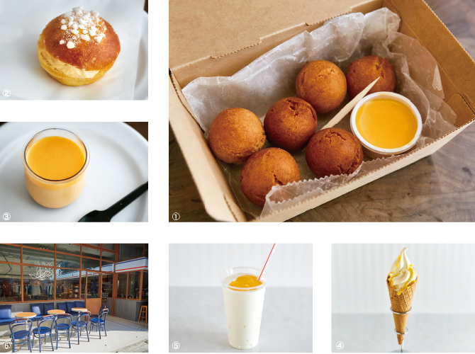 ①EGG DOUGHNUT ¥370(税別):日本のテイクアウトメニューの定番品たこ焼きの様なコロっと した丸型ドーナッツ。卵味の濃い甘味のあるドーナッツにエッグ ジャムをかけて食べる体験は他には無いドーナッツの楽しみ方。