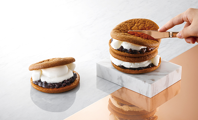 別立て製法でつくったふんわり生地をさらに蒸すことで、しっとり上品な口あたりに仕上げた和菓子の定番どら焼きにスポンジケーキのようなふんわりとした食感をとりいれている。その生地に大人の味わいの北海道産クリーム使用の生クリーム、粒を立たせた甘さ控えめのあん、そしてもちもちの求肥がサンドされたぜいたくなどら焼き。価格は1個300円(税別)で、1人4個まで購入可能。
