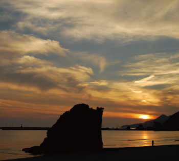 日本の渚百選にも選定されている大社町にある砂浜。国譲り神話の舞台でもあり、旧暦10月になると全国の神様が海路で出雲にやってきて、人々の縁を決める大会議を行うこととされています。そのお迎えする場所となっているのが、この稲佐の浜となっています。