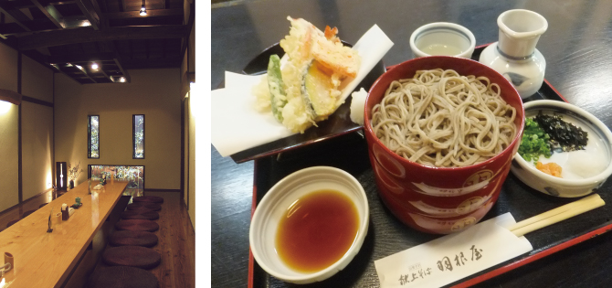 左:落ち着いた雰囲気の店内 右:天ぷら割子