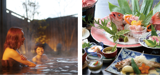 左:貸切風呂 / ふる里(店舗) 右:ノドグロのフルコースなど新鮮な魚介類や旬な食材が楽しめる