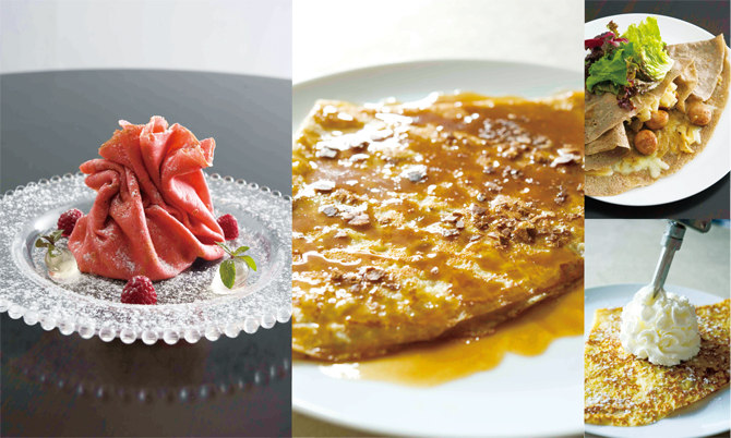 (右上:バラ色の人生)バラの香りのクレープ生地で、ベリークリーム、シャーベットが入ったティ・ロランドの名物。その美しさにナイフを入れるのはためらう程の綺麗なシルエット。 (左上:塩バターキャラメル)クレープの生地を生かした1品、塩バターの塩味とキャラメルのほろ苦さがほのかにある甘みを際立たせている。生地の美味しさを楽しむためにも、一度は必ず注文したい一品。 (右下:ブルトン)ブルターニュ風ソーセージとチーズ、ポテトのドフィノワのガレット。ガレットのもちもちした食感と、中に結構具材が入っているので、ボリューミー。 (左下:シャンティクリーム)特殊ガスで膨らませた生クリーム。クレープのトッピングとしても人気。ホイップクリームより軽い口あたりで、口の中ですっと溶けていく。