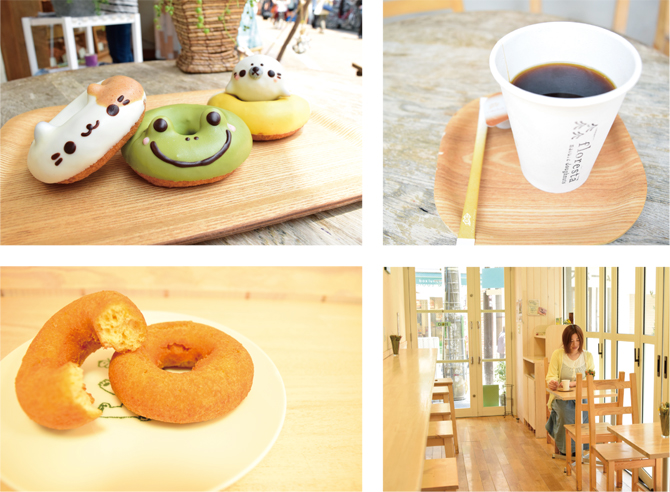 (左上:どうぶつドーナツ) 「こんなドーナツあったらいいなコンテスト」から産まれた"どうぶつドーナツ"。種類も増えてフロレスタの人気商品。ベースはネイチャーなので見た目も味も最高のドーナツ。 (左下:ネイチャードーナツ) フロレスタの原点となるドーナツ。シンプルなのにやみつきになる美味しさ。お店では常に揚げたてをご用意。 (右上:オリジナルコーヒー)京都の老舗小川珈琲にブレンドをお願いしたオリジナル。コロンビア、メキシコ、ペルー、ブラジルの4か国の厳選されたアラビカ種のオーガニック豆をブレンドした、爽やかな香りと甘さを活かしたドーナツにぴったりのまろやかなコーヒー。