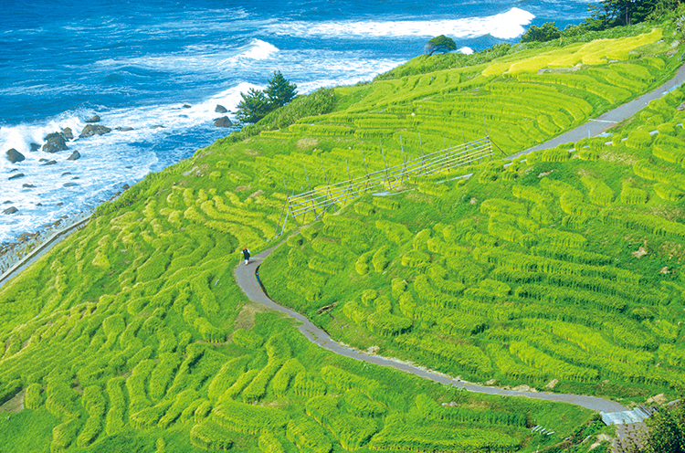 奥能登の最高峰である高州山の裾野の1.2ヘクタールにわたる急斜面に、小さな水田が階段状に無数に広がっています。1枚の田んぼの面積は18㎡ほどで、機械を入れる事のできない広さ。そのため農作業は全て人の手によって行われ、平地の数倍の労力を必要とします。水田の高低差は53mあり、日本海に向かって広がる雄大な景観はまさに絶景。5月の田植えの時期は、水田に空の青色や太陽が反射され、様々な色に変化します。夏には若々しくすくすくと成長した夏緑の棚田が。秋には頭を垂れるように豊にに実った稲穂が黄金色に輝き、冬にはイルミネーションが設置され風光明媚な光のシャワーが広がります。1年を通じて様々な表情を見せ、四季折々の景観を楽しむことができます。