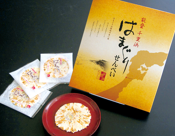 はまぐりせんべい はまぐりの香りが食欲をそそります! はまぐりが丸ごと入った「はまぐりせんべい」は焼き方が難しく、今までほとんど商品化されていない珍しいおせんべいです。パリッとした食感とはまぐりの風味は、やみつきになる味です。千里浜レストハウス ☎0767-22-2141 石川県羽咋市千里浜町タ4番地の1 |