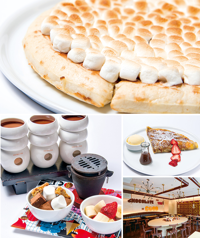 (上:チョコレートチャンクピザ) もっちり生地に溶けたミルクとホワイトチョコレートチャンクを乗せ、トーストしたマシュマロをトッピングした、 一番人気の商品だ。9/8~10/31までの期間砕いたマロングラッセとマロンクリームをトッピングした「チョコレートチャンク マロンピザ」と、かぼちゃの風味豊かな「パンプキンスパイスモカ」の2種類が登場。 (左下:クラシックヨーロピアンフォンデュ) ミルク/ ダーク / ホワイトの中からお好みのチョコレート2種類とトフィーソースにフルーツ、焼き菓子、グリルで炙ったマシュマロをディップ。 (右中:ストロベリーヘーゼルナッツクレープ)ヘーゼルナッツ・チョコレートクリームとストロベリーをサンド、バニラアイスを添えて。 オシャレスポット表参道ヒルズに構えるチョコレート専門店。イスラエル発のチョコレートブランドで、ニューヨークを始め世界各国に店舗を展開し、 数時間もの行列を作ることで有名な世界的大人気のチョコレートバーなのだ。その人気はチョコレートへのこだわりと、チョコレートを楽しんでもらいたいという心意気によるものが大きい。 チョコレートのテーマパークのような店内には、五感を刺激するインテリア、ユニークな食器、ポップなパッケージが並び、 新しいチョコレートの楽しみ方など今迄にないチョコレートエンターテインメントを提供している。一番人気のチョコレートチャンクピザは、 見た目からしてインパクト抜群。もっちりした生地は少し塩味があり、チョコレートとマシュマロの甘さとよくマッチしている。 生地を覆うトーストされたマシュマロはカリッとした食感と口に入れた時にチョコレートと共にとろけるのが魅力で訪れたお客は必ず頼む一品だ。 チョコレートという食品でここまで楽しませてくれる、MAX BRENNER CHOCOLATE BARはもはや飲食店の域を超えて、究極のスイーツスポットだと言えるだろう。 楽しく、甘くて美味しいチョコレートを堪能したい方は是非MAX BRENNER CHOCOLATE BAR表参道ヒルズへ行ってみて欲しい。