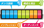 反響ポイントは「ダンス技術部門」「構成・演出部門」「インプレッション部門」「オーディエンス部門」から上位8ナンバー(オーディエンスは6位まで)をピックアップし、順位に対応したポイントを換算します。8位未満(ダンス技術部門のみ7位未満)の得点は加算され無い為、表記されない。
