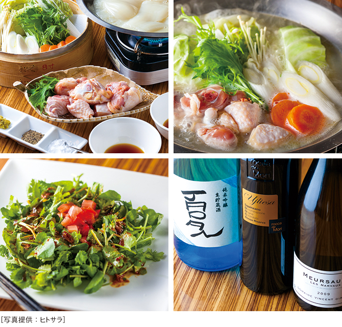 (右上・左上:横鍋JAPANオリジナル水炊き鍋 艶鍋)鶏ガラと野菜を8時間以上じっくり煮込んで作った、化学調味料を一切使用していないプルプルのコラーゲン100%の鍋。素材の味がぎゅっとつまったスープと一緒に大山地鶏と野菜を堪能できる。締めには雑炊、フォー、うどんがオススメ。 (左下:パクチーサラダ)パクチーをふんだんに使い、クレソンと大葉を合わせたサラダ。 (右下:種類豊富なお酒)女子に嬉しい果実酒をはじめ、日本酒やワイン等、お鍋と共に楽しめるお酒が豊富。 それぞれの駅に独自のカルチャーがある中央線。その中の一つである阿佐ヶ谷に、オススメしたい鍋屋がある。その名も横鍋JAPANだ。 名前からはちゃんこ鍋を思わせるような力強い印象を受けるが、実際はコラーゲンを溶かして食べる美容に最適の鍋や、様々な梅酒や果実酒、ワインを揃えたおしゃれなお店なのだ。 お店自慢の「艶鍋」は鳥取県産の大山地鶏と野菜を8時間煮込んで作られたコラーゲンを溶かして出汁にする鍋で、お店の代表的メニューとなっている。よくコラーゲンボールを溶かす鍋は目にするが、横鍋JAPANではボールどころの騒ぎではない。塊が鍋いっぱいに広がっているのだ。そして嬉しい事に、トマト、カレー、明太子、ベトナム風など様々な種類の味を選ぶ事が出来るので、何度来ても楽しめる鍋になっている。また鍋のスープだけでなく、お手製のポン酢などのつけだれも絶品だ。 阿佐ヶ谷といえば、お酒好きの人が好むようなパンチのあるような店が多い中、海辺のリゾートのような落ち着いた店内、目線を合わせて隣に並んで鍋を頂く新しいスタイルを提供する横鍋JAPANは女性やカップルにオススメしたいおしゃれなお店だ。