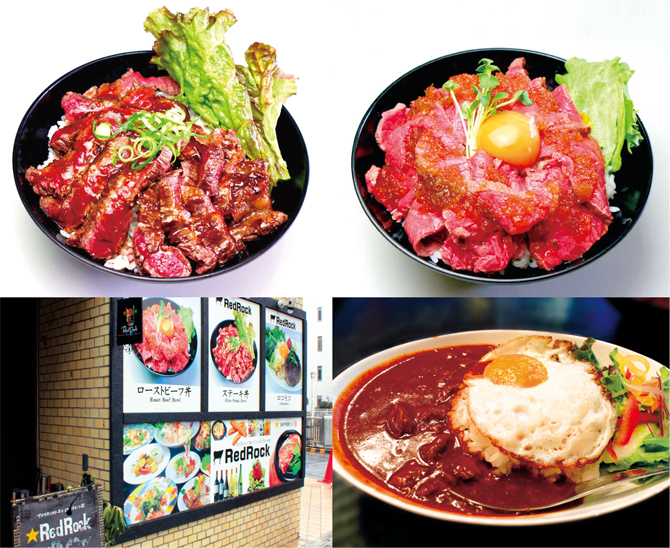 (右上:ローストビーフ丼)厳選された赤身を独自製法で長時間かけて火を入れ、自家製ダレでじっくりローストし、込んだローストビーフを使用。人気no.1メニュー。